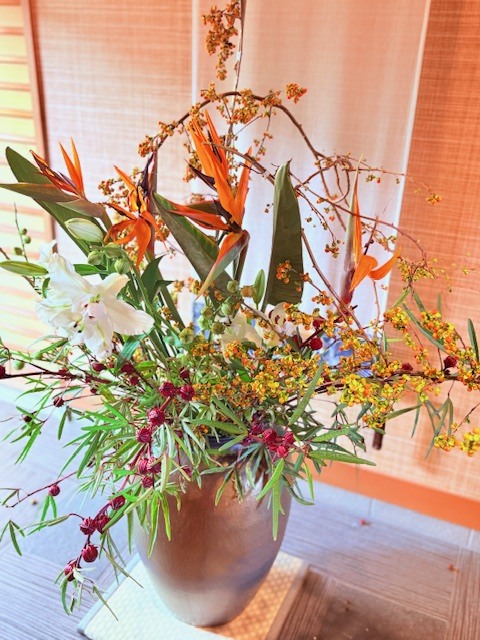本日は、久々に「玄関花」が変わりましたのでご紹介させていただきます。今回の玄関花は、ツルウメモドキやローゼルを使用した玄関花になっております。ツルウメモドキのオレンジ色、ローゼルの赤色を見ていると、玄関がパッと明るく華やかに感じます。